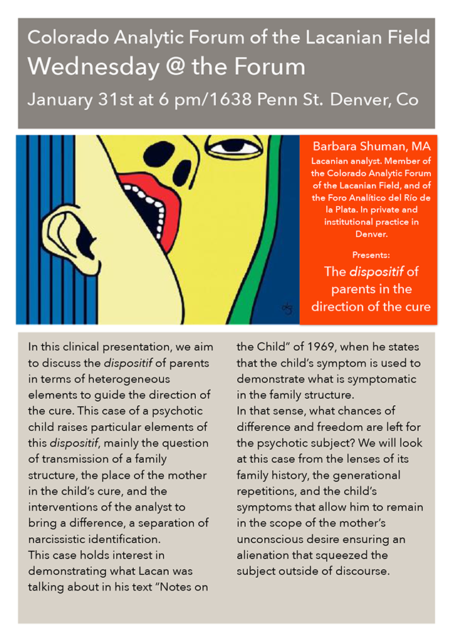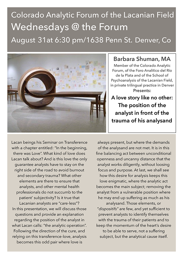 My formation as an analyst began ten years ago when I entered the Clinical College of Colorado and became a member of the Colorado Analytic Forum of the Lacanian Field. I currently teach theoretical and clinical seminars on Freudian and Lacanian Psychoanalysis. I have presented several papers on a variety of topics, including ethics, the analytic clinic with children, and the essential element in the relationship between the analyst and the “analysand” known as transference. I also provide supervision for clinicians and consultation on cases following the psychoanalytic lens.